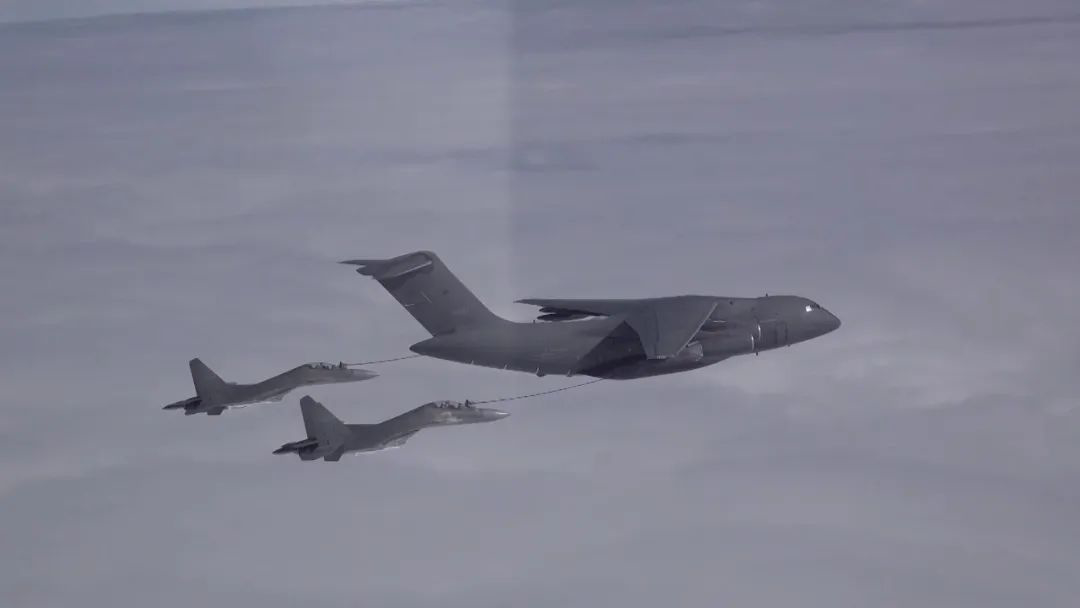 俄国防部称,中俄轰炸机编队在日本海和东海水域上空进行了长约8小时巡航,俄空天军苏-30SM和苏-35S战机进行了护航。