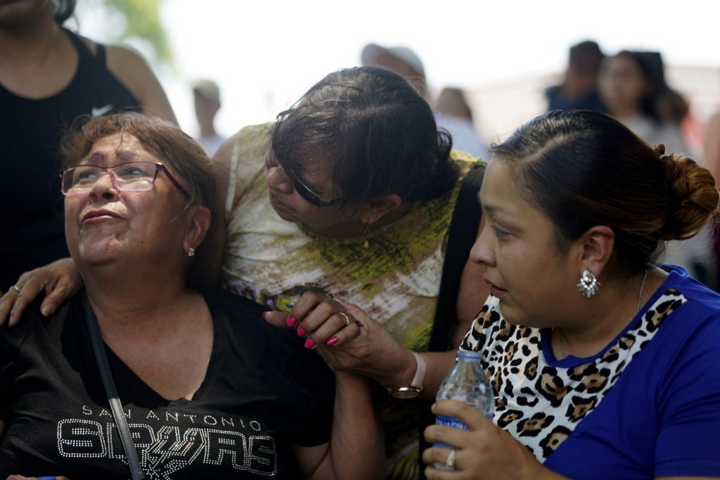 2022年5月28日,枪击事件遇害者家属在美国得克萨斯州南部尤瓦尔迪市的城市广场参加哀悼活动。新华社记者吴晓凌摄