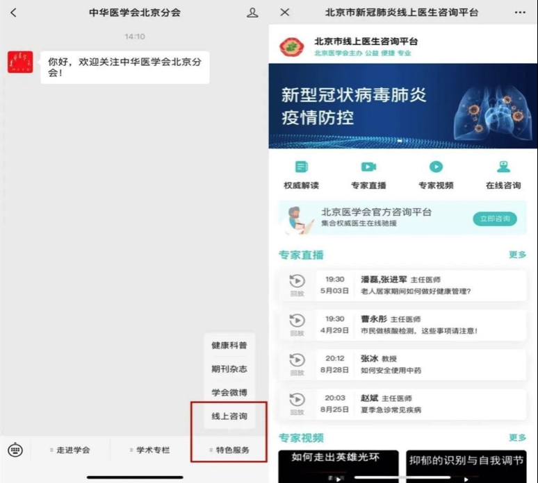 市民可通过微信公众号搜索中华医学会北京分会,关注并进入“中华医学会北京分会公众号”,点击底部菜单栏“特色服务”,点击“线上咨询”,进入平台。