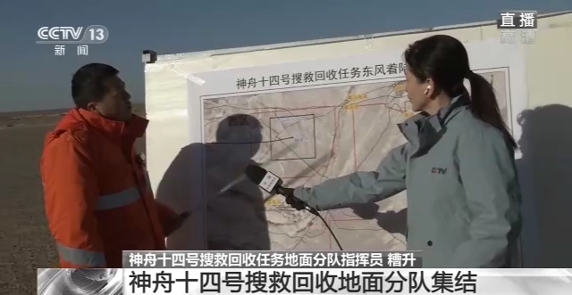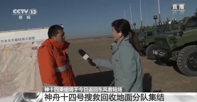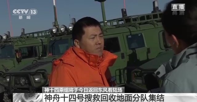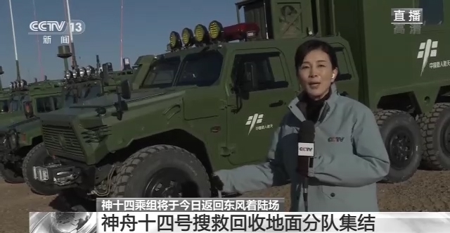 总台央视记者 刘洁:这里是搜救回收地面分队的集结点。随着神舟十四号返回时间的临近,东风着陆场的搜救力量也做好了充分的准备。搜救力量是由多个分队组成的,有空中分队、地面分队、机动分队等,每个分队都各有所长。他们先是自己分队进行小系统的训练,然后是空中和地面分队的合练,最后是全系统全要素的综合演练,可以说现在各个分队间的配合已经是非常默契。地面分队的主要任务就是对返回舱进行搜救,同时对航天员进行第一时间的医监医保处置,还有就是对返回舱后续的转运等相关的工作。