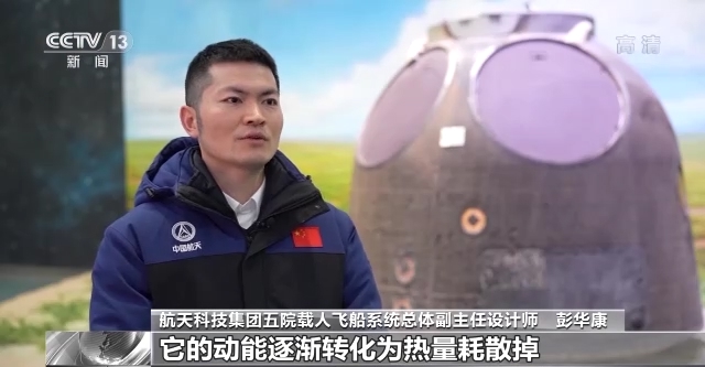 航天科技集团五院载人飞船系统总体副主任设计师 彭华康:高温材料的碳化剥落会带走大量的热量,然后我们返回舱的动能逐渐变小,它的动能逐渐的转化为热量耗散掉,然后它的速度也由第一宇宙速度,也就是七点几公里每秒的速度,逐渐降低到几百米每秒。