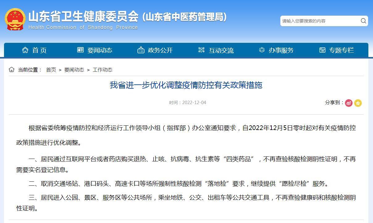 山东省卫健委官网12月4日发布进一步优化调整疫情防控有关政策措施,详情如下: