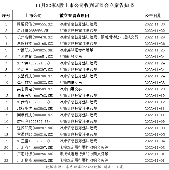 据东方财富Choice数据显示,11月1日—11月30日,A股22上市家公司收到来自证监会的立案告知书,数量创年内新高。记者梳理发现,众多上市公司及其实控人、高管成为调查对象,信息披露违规成为监管“重灾区”。