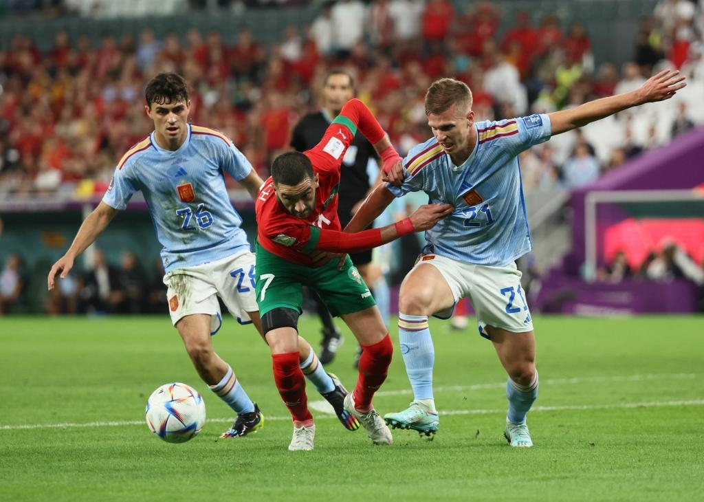 12月6日,摩洛哥队球员齐耶赫(中)与西班牙队球员奥尔莫(右)在比赛中拼抢。新华社记者 兰红光 摄