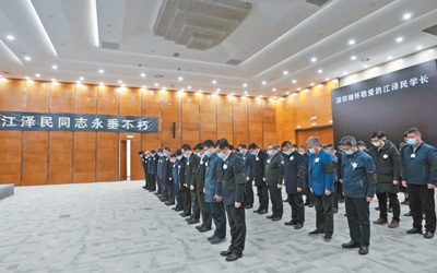这是在陕西西安的中铁二十局集团,干部职工收看江泽民同志追悼大会直播。新华社记者 张博文摄