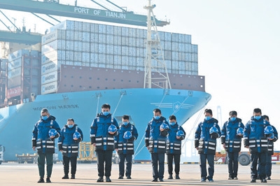 这是在天津港太平洋国际集装箱码头,职工肃立默哀。新华社记者 赵子硕摄