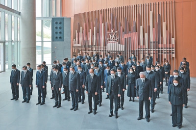 这是在山东省青岛市,干部职工肃立默哀。新华社记者 李紫恒摄