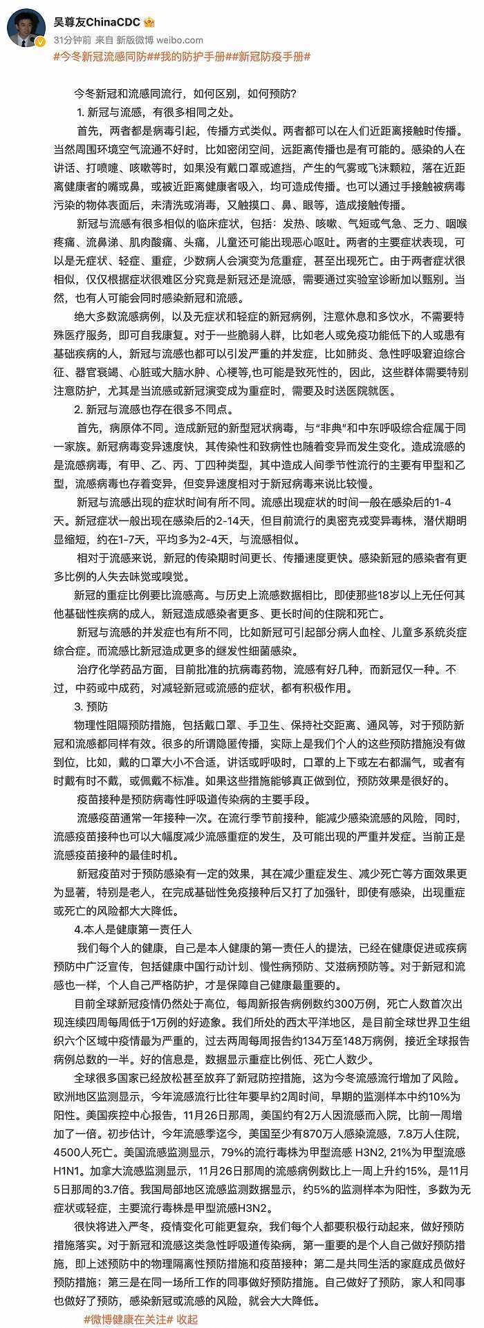 中国疾控中心流行病学首席专家吴尊友12月7日在微博发文,介绍新冠和流感的异同,以及在今冬新冠和流感同流行的形势下如何预防。