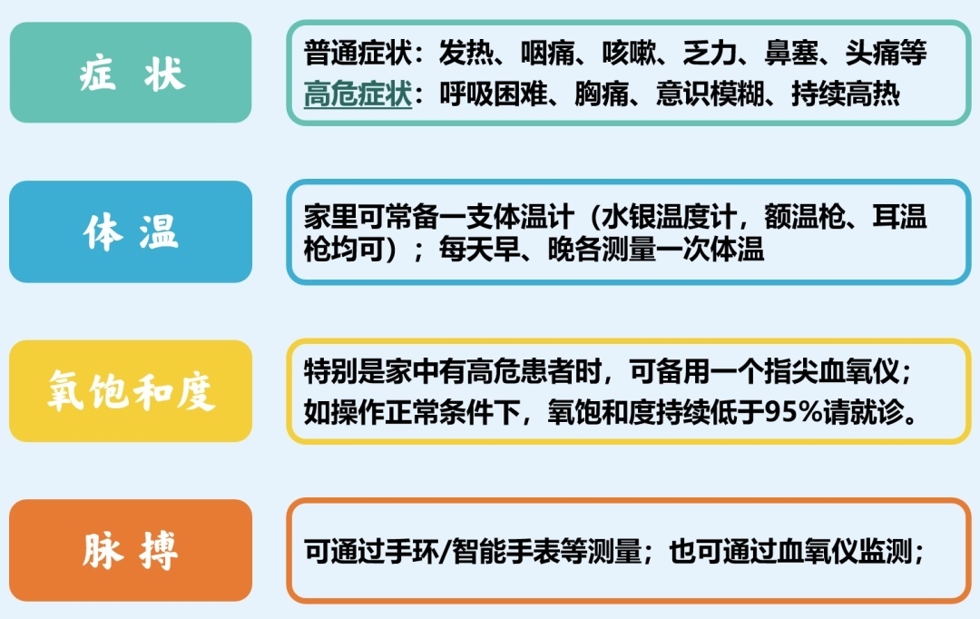 对于选择在家隔离和康复的感染者,在保证自己能够吃好,休息好的同时,还需要学会自己监测以下指标:症状,体温,脉搏,氧饱和度。
