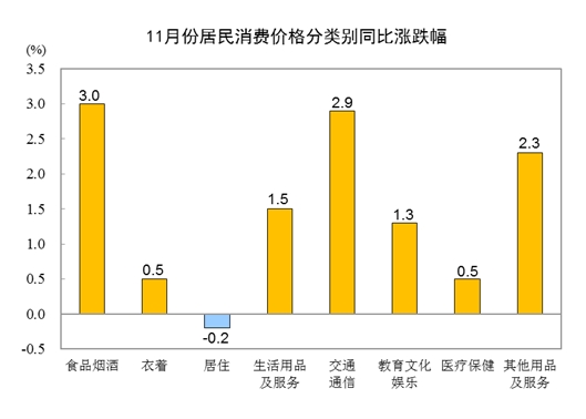 11月份,食品烟酒类价格环比下降0.5%,影响CPI下降约0.14个百分点。食品中,鲜菜价格下降8.3%,影响CPI下降约0.18个百分点;水产品价格下降1.1%,影响CPI下降约0.02个百分点;猪肉价格下降0.7%,影响CPI下降约0.01个百分点;鲜果价格上涨1.5%,影响CPI上涨约0.03个百分点;蛋类价格上涨1.3%,影响CPI上涨约0.01个百分点。