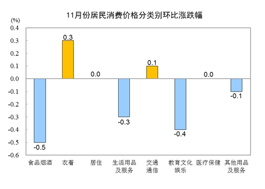 11月份,全国居民消费价格环比下降0.2%。其中,城市下降0.2%,农村下降0.2%;食品价格下降0.8%,非食品价格持平;消费品价格下降0.1%,服务价格下降0.2%。