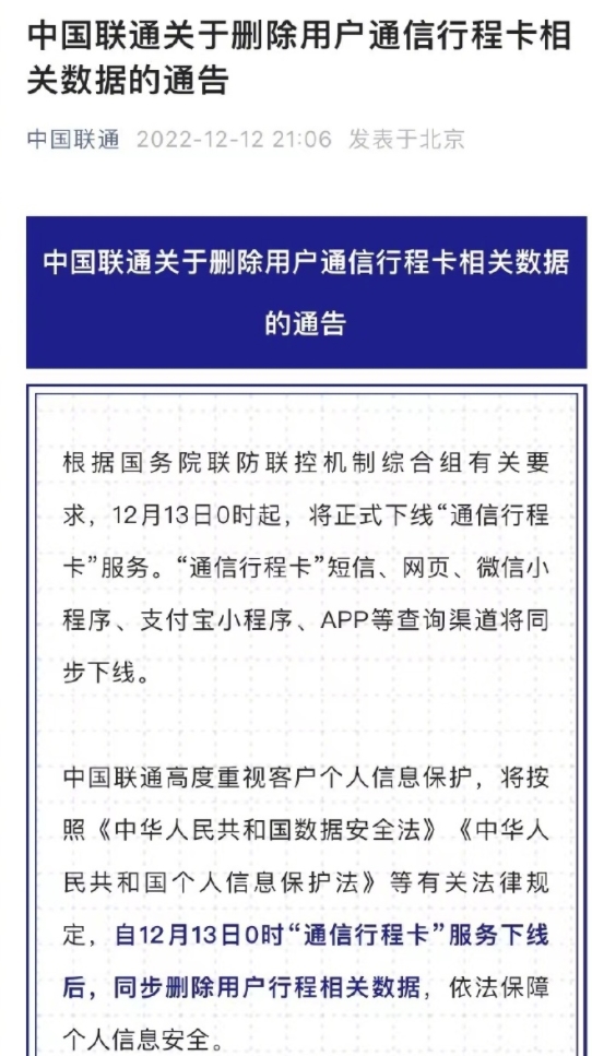 中国联通高度重视客户个人信息保护,将按照《中华人民共和国数据安全法》《中华人民共和国个人信息保护法》等有关法律规定,自12月13日0时“通信行程卡”服务下线后,同步删除用户行程相关数据,依法保障个人信息安全。
