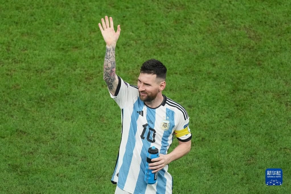 12月13日,阿根廷队球员梅西在比赛后向观众致意。新华社记者 潘昱龙 摄