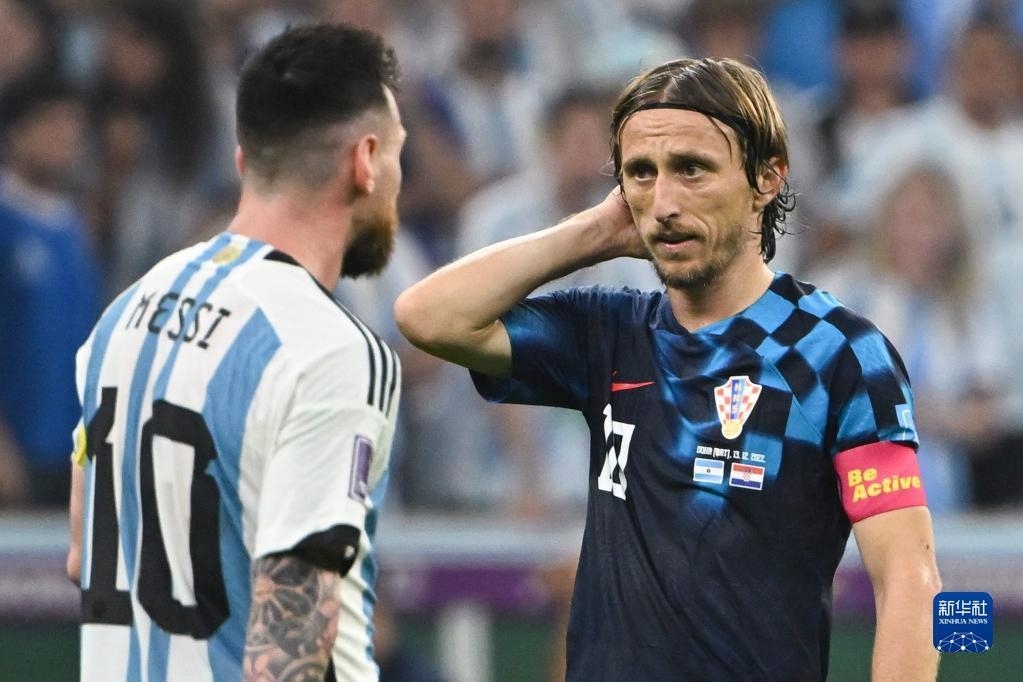 12月13日,克罗地亚队球员莫德里奇(右)与阿根廷队球员梅西在比赛中。新华社记者 李尕 摄
