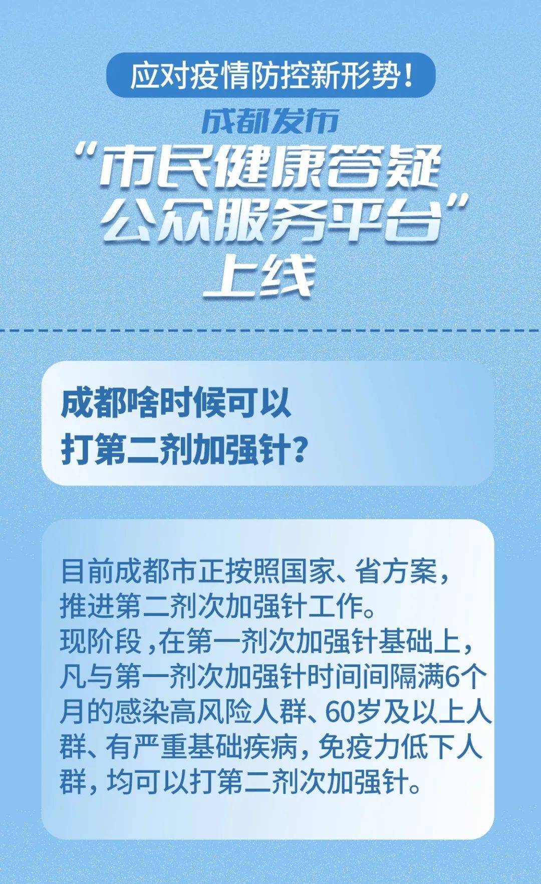 目前成都市正按照国家、省方案,推进第二剂次加强针工作。现阶段,在第一剂次加强针基础上,凡与第一剂次加强针时间间隔满6个月的感染高风险人群、60岁及以上人群、有严重基础疾病,免疫力低下人群,均可以打第二剂次加强针。