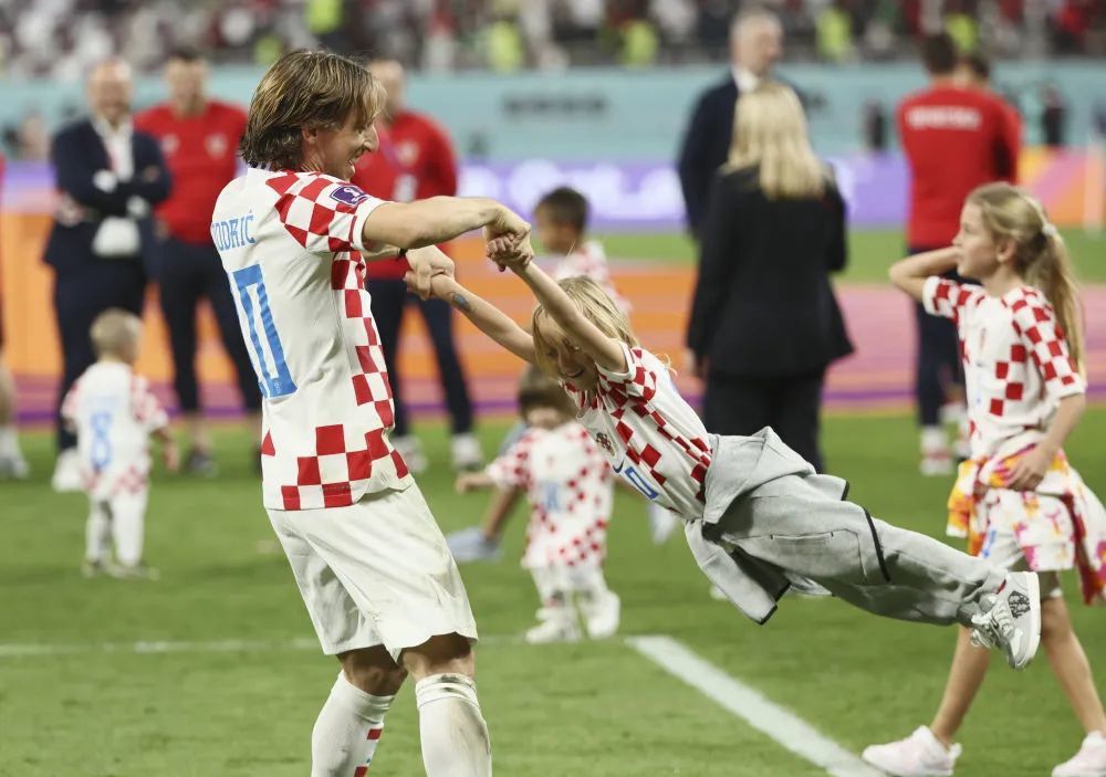 12月17日,克罗地亚队球员莫德里奇(左)在比赛后与孩子庆祝。新华社记者 兰红光 摄