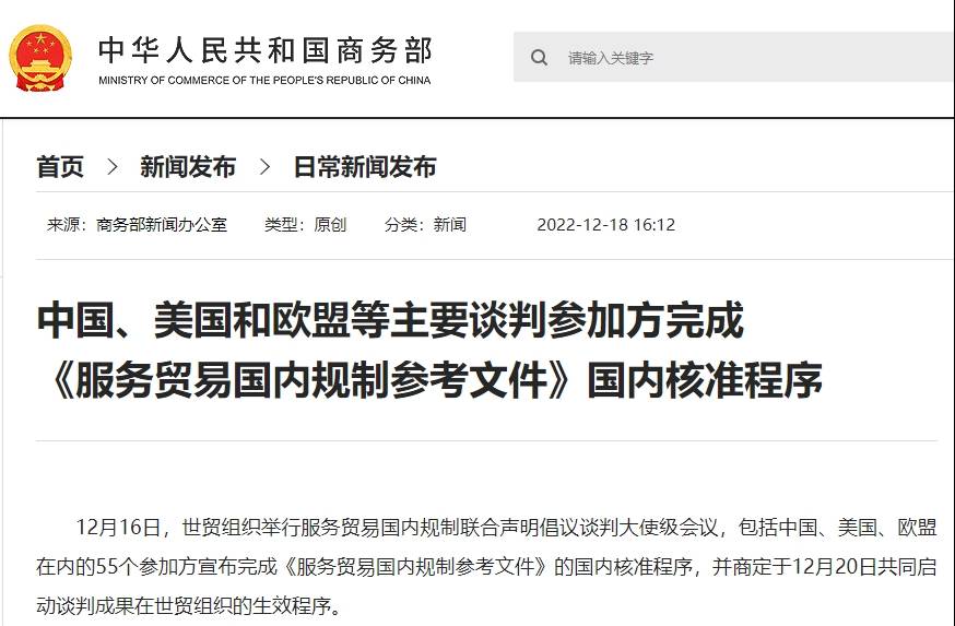 商务部今天(18日)消息,12月16日,世贸组织举行服务贸易国内规制联合声明倡议谈判大使级会议,包括中国、美国、欧盟在内的55个参加方宣布完成《服务贸易国内规制参考文件》的国内核准程序,并商定于12月20日共同启动谈判成果在世贸组织的生效程序。