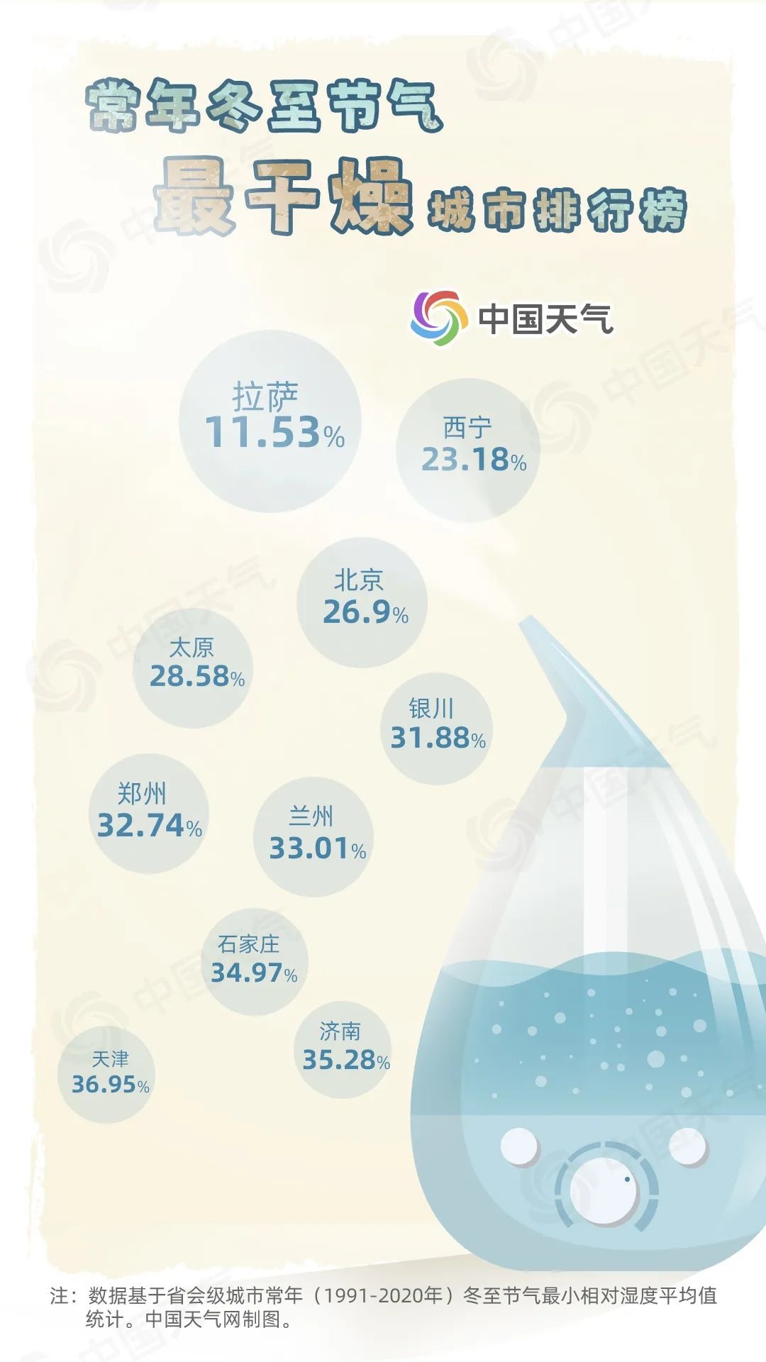 中国天气网首席气象分析师胡啸介绍,拉萨属高原高山气候区,海拔高,冬至期间降水量少且平均日照时间长,即使产生降水也容易蒸发,拉萨位列全国干燥城市排行榜第一当之无愧。北京、太原、郑州等城市冬季本来雨雪就稀少,且频繁遭受寒冷干燥的冷空气影响,湿度低,这一时节也就格外干燥。