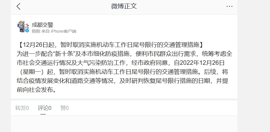 为进一步配合“新十条”及本市细化防疫措施,便利市民群众出行需求,统筹考虑全市社会交通运行情况及大气污染防治工作,经成都市政府同意,自2022年12月26日(星期一)起,暂时取消实施机动车工作日尾号限行的交通管理措施。后续,将结合疫情发展变化和道路交通等情况,及时研判恢复尾号限行措施的日期,并提前向社会发布。