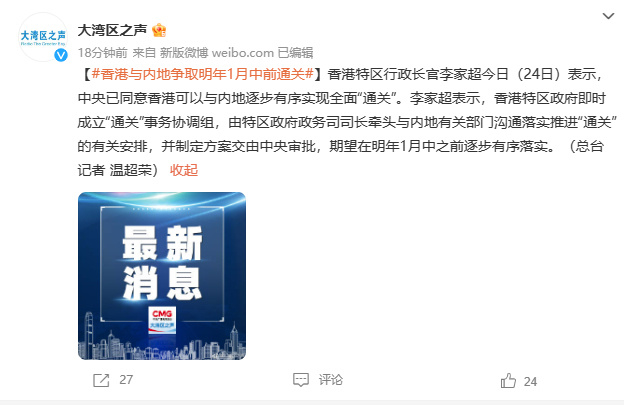 据@大湾区之声 报道,香港特区行政长官李家超今日(24日)表示,中央已同意香港可以与内地逐步有序实现全面“通关”。李家超表示,香港特区政府即时成立“通关”事务协调组,由特区政府政务司司长牵头与内地有关部门沟通落实推进“通关”的有关安排,并制定方案交由中央审批,期望在明年1月中之前逐步有序落实。(总台记者 温超荣)