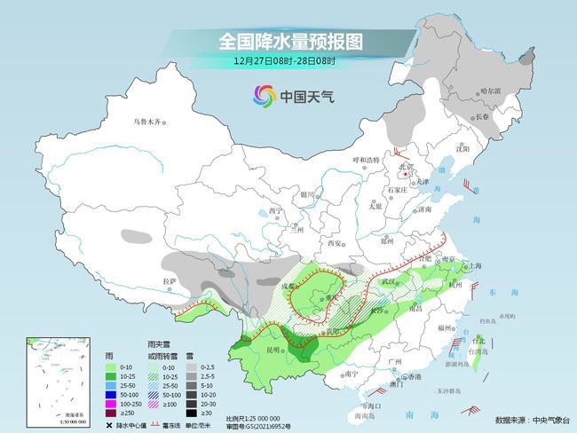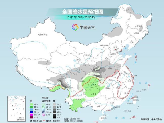今起三天(12月25日至27日),冷空气继续影响我国,雨雪天气范围向东扩展,其中陕西、四川盆地等地部分地区降雪量级较大,当地需注意低能见度及积雪对出行的不利影响。同时,西北地区东部及东北等地降温模式开启,一整天天寒地冻,公众需注意防寒,居家科学使用取暖设备。