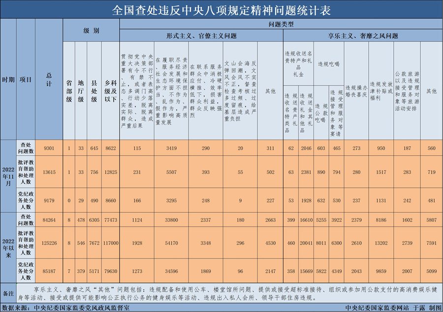 中央纪委国家监委网站 陆丽环报道 12月27日,中央纪委国家监委公布了2022年11月全国查处违反中央八项规定精神问题汇总情况。今年11月,全国共查处违反中央八项规定精神问题9301起,批评教育帮助和处理13615人,其中,党纪政务处分9179人,这是连续第111个月公布月报数据。