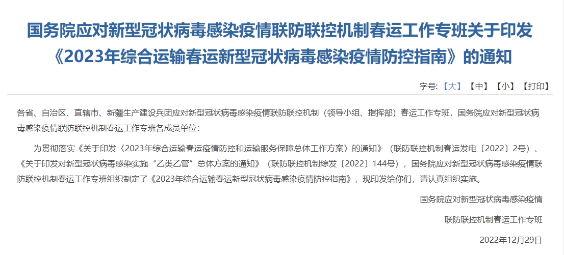 2022年12月26日,国务院联防联控机制综合组印发了《关于对新型冠状病毒感染实施“乙类乙管”的总体方案》(联防联控机制综发〔2022〕144号,以下简称《总体方案》)。根据《总体方案》,我部优化调整了交通运输领域有关疫情防控措施,自2023年1月8日起实施。现将有关事项通知如下: