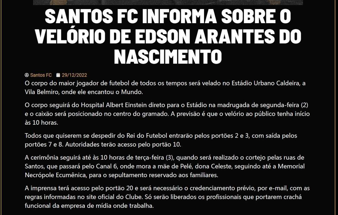 据巴西桑托斯足球俱乐部介绍,当地时间2023年1月2日上午,贝利的灵柩将从医院被运送至圣保罗郊外的维拉贝尔米罗体育场,并放置在球场中央。遗体告别仪式将从2日上午10时开始,持续至3日上午10时。