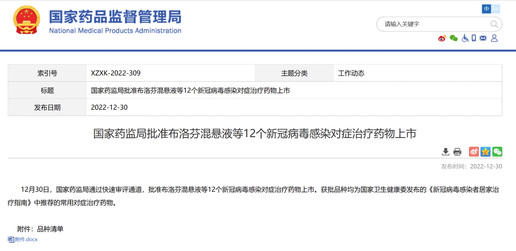 12月30日,国家药监局通过快速审评通道,批准布洛芬混悬液等12个新冠病毒感染对症治疗药物上市。获批品种均为国家卫生健康委发布的《新冠病毒感染者居家治疗指南》中推荐的常用对症治疗药物。