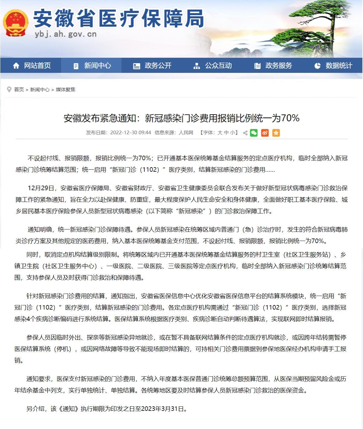 据安徽省医疗保障局消息,12月29日,安徽省医疗保障局、安徽省财政厅、安徽省卫生健康委员会联合发布关于做好新型冠状病毒感染门诊救治保障工作的紧急通知,明确参保人员新冠感染在统筹区域内普通门(急)诊治疗时,发生的符合新冠病毒肺炎诊疗方案及其他规定的医药费用,纳入基本医保统筹基金支付范围,不设起付线、报销限额,报销比例统一为70%。