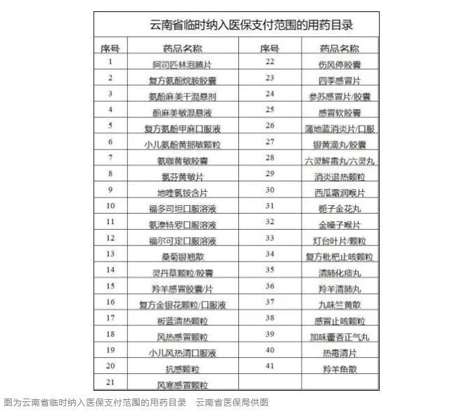 云南省医疗保障局12月30日消息,《云南省新冠病毒感染者用药目录(试行第一版)》中“桑菊银翘散”等41个药品已临时纳入医保支付范围,按甲类药品管理,进一步满足民众就医购药需求,减轻新冠感染患者费用负担。
