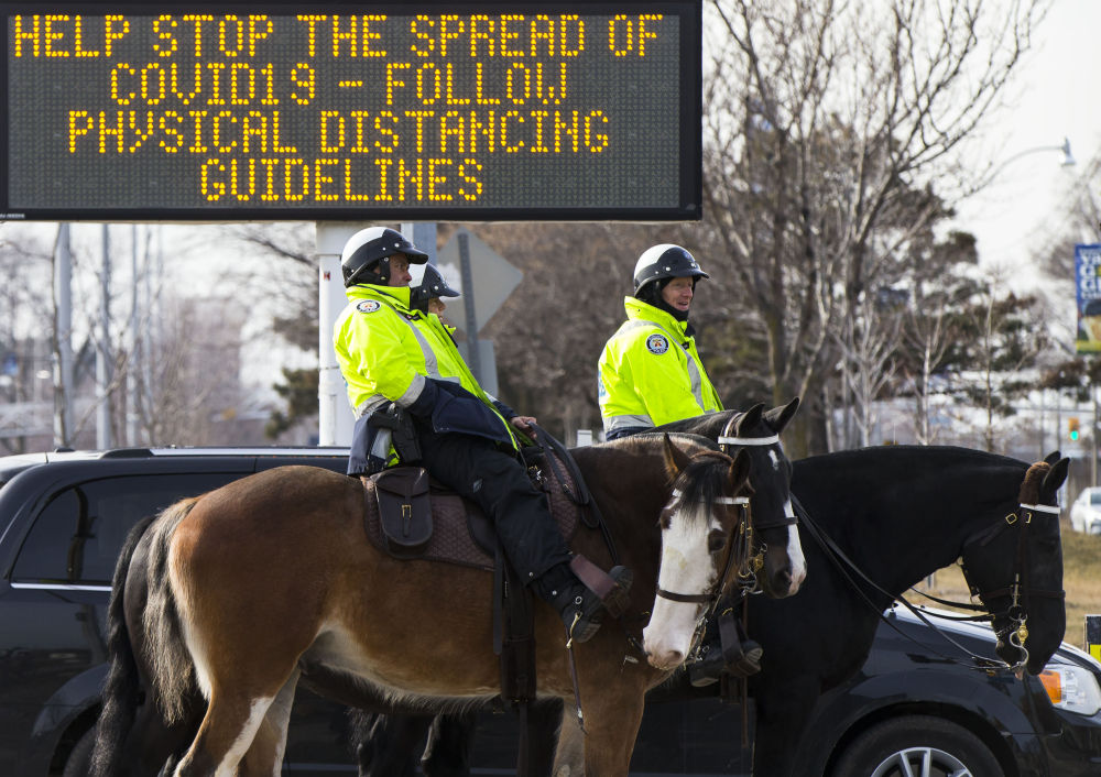 2021年1月25日,在加拿大多伦多,骑警在街头巡逻。新华社发(邹峥摄)