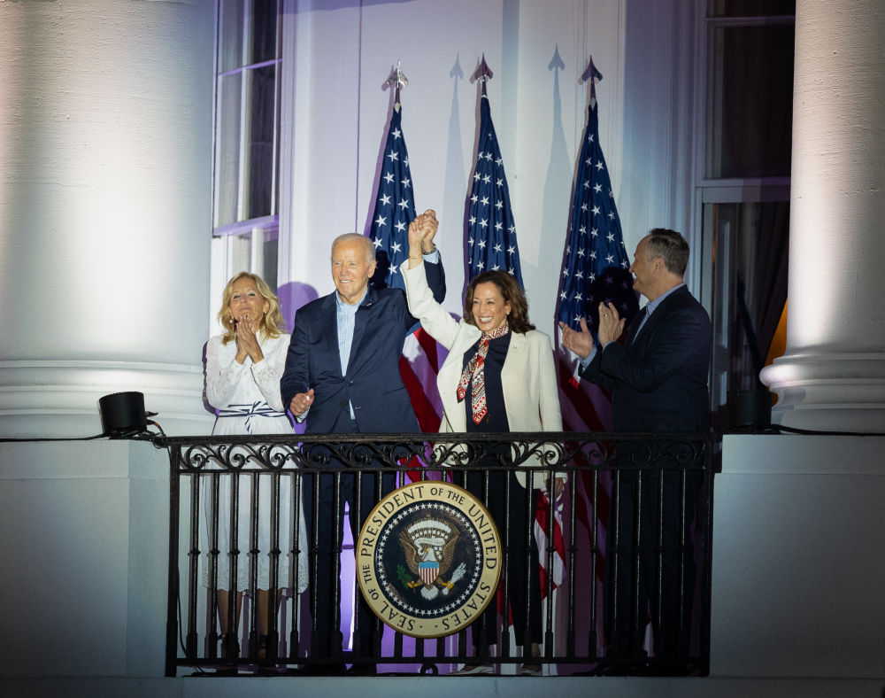 这是7月4日在美国首都华盛顿白宫拍摄的美国总统拜登(左二)和副总统哈里斯(右二)。新华社记者胡友松摄