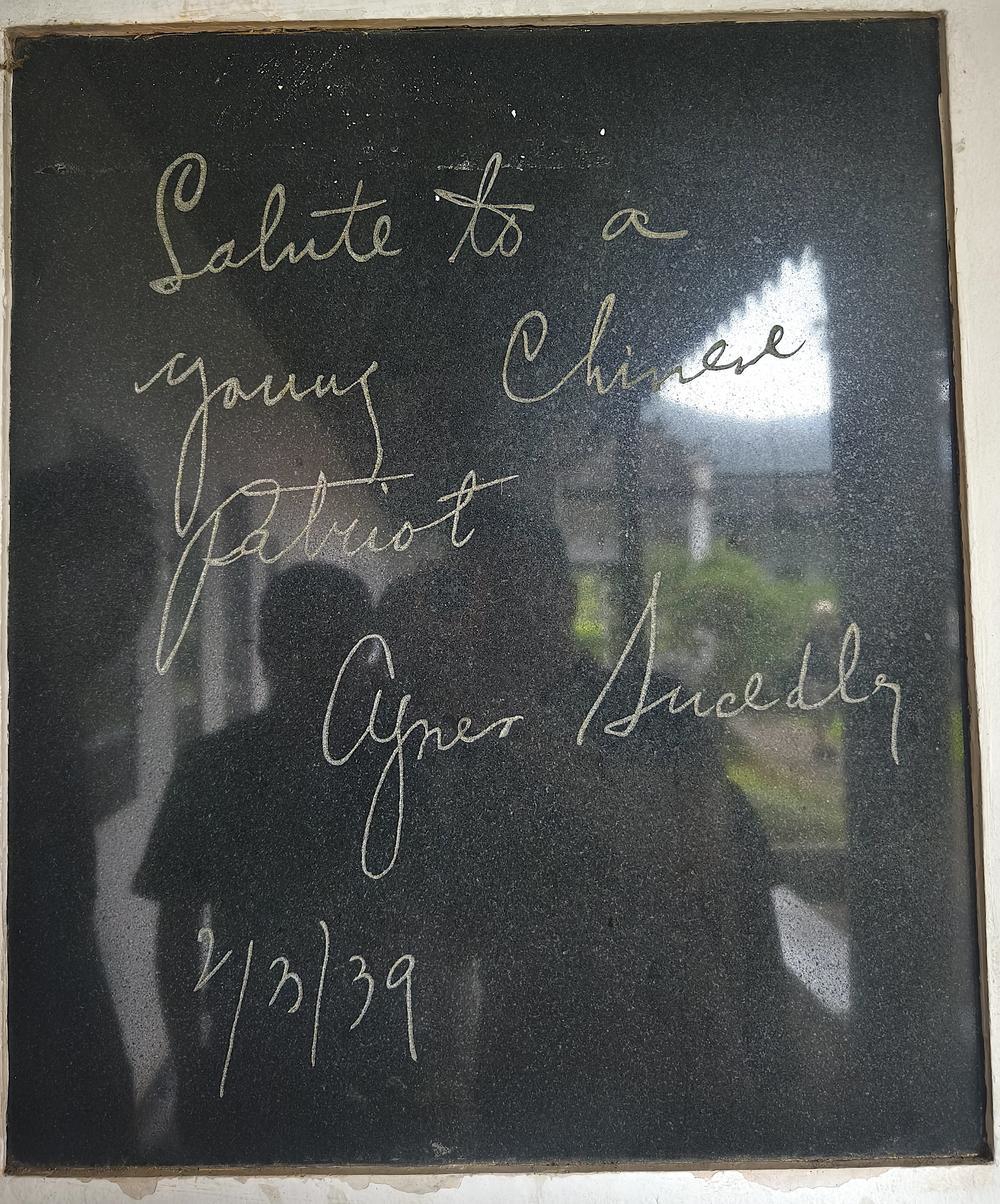 1939年史沫特莱写给新四军教导总队学员葛凉的一句话语,如今也被镌刻在石碑之上——“Salute to a young Chinese patriot(向一位年轻的中国爱国者致敬)”。