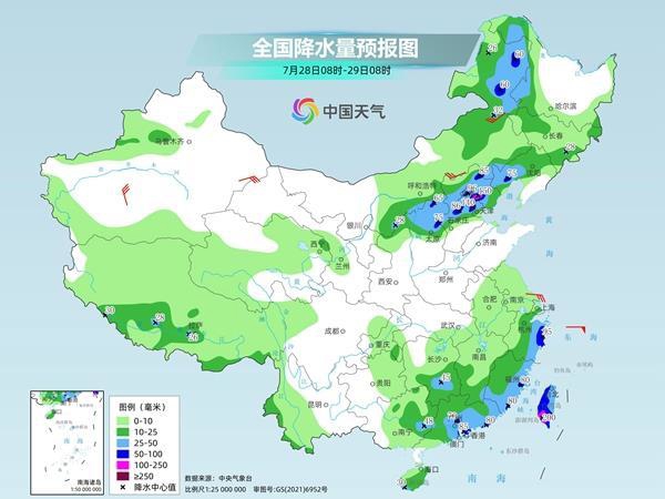 昨天,随着副热带高压减弱东退,水汽向北输送减少,华北、东北一带的强降雨有所缩减,同时华东地区出现较大范围强降雨。监测显示,昨天8时至今天6时,北京东北部和南部、河北中部和东北部及浙江北部、江西中部、福建中南部、云南西南部、台湾岛中西部等地部分地区出现大到暴雨、局地大暴雨,河北承德兴隆和台湾岛西部局地出现特大暴雨。