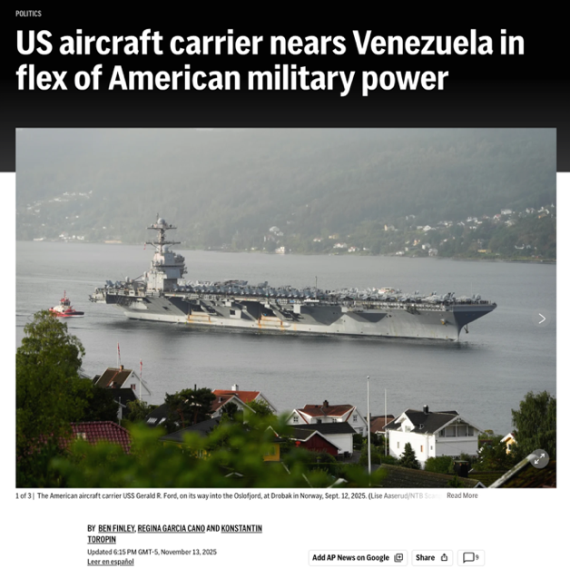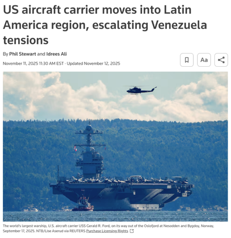 △美联社报道,“福特”号航母将在数日内抵达委内瑞拉近海,美国的这种军事力量展示,在拉美已有数代人未曾见过。