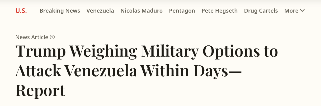 △美国《新闻周刊》报道,特朗普正在权衡于数日内对委内瑞拉发起军事打击。