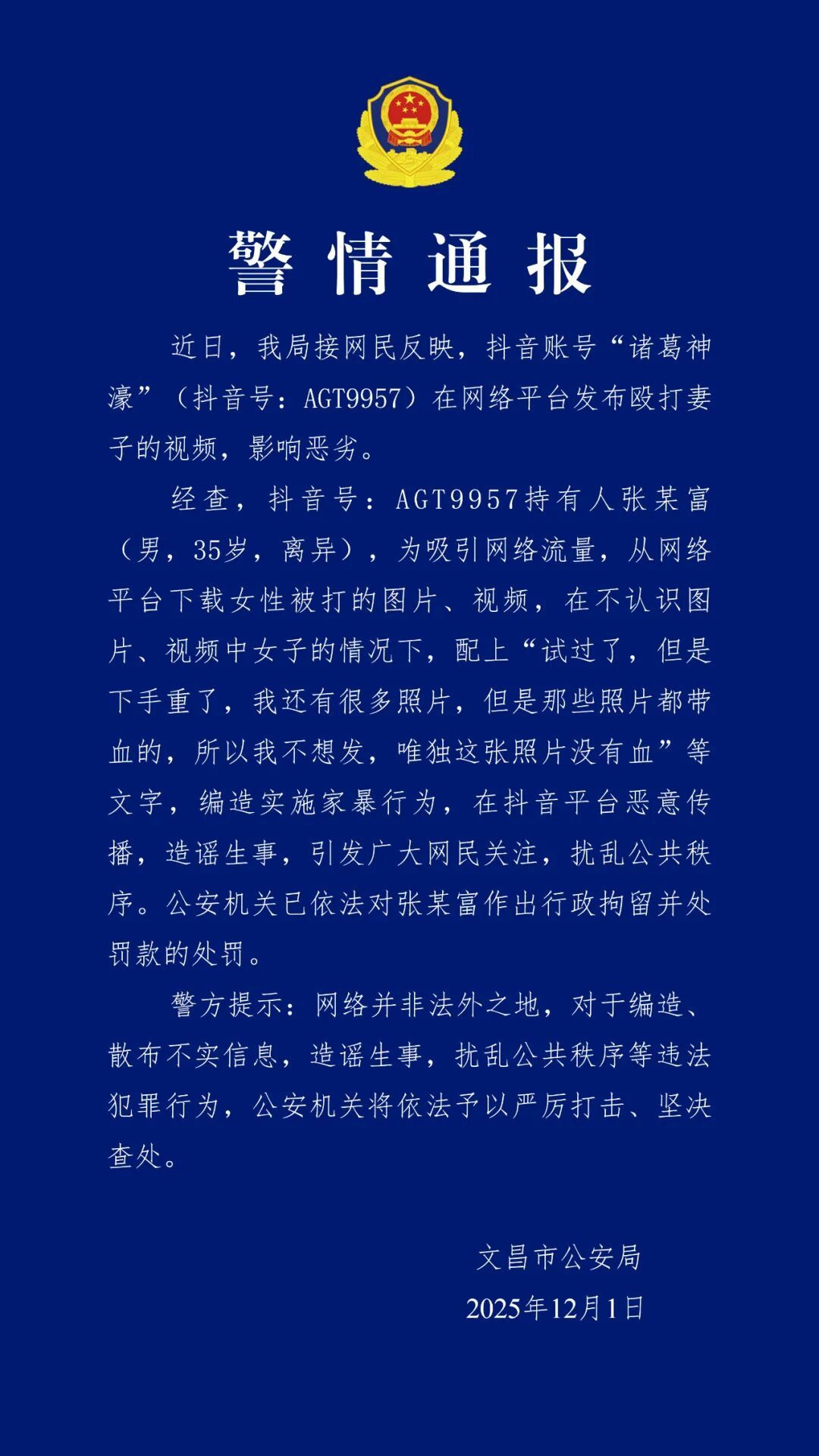 央视网消息:海南文昌市公安局12月1日发布警情通报:近日,接网民反映,抖音账号“诸葛神濠”(抖音号:AGT9957)在网络平台发布殴打妻子的视频,影响恶劣。经查,抖音号AGT9957持有人张某富(男,35岁,离异),为吸引网络流量,从网络平台下载女性被打的图片、视频,在不认识图片、视频中女子的情况下,配上“试过了,但是下手重了,我还有很多照片,但是那些照片都带血的,所以我不想发,唯独这张照片没有血”等文字,编造实施家暴行为,在抖音平台恶意传播,造谣生事,引发广大网民关注,扰乱公共秩序。公安机关已依法对张某富作出行政拘留并处罚款的处罚。