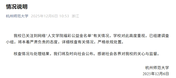 我校已关注到网络“人文学院福彩公益金名单”有关情况,学校对此高度重视,已组建调查小组,将本着严肃负责的态度,详细核查有关情况,严格依规处置。
