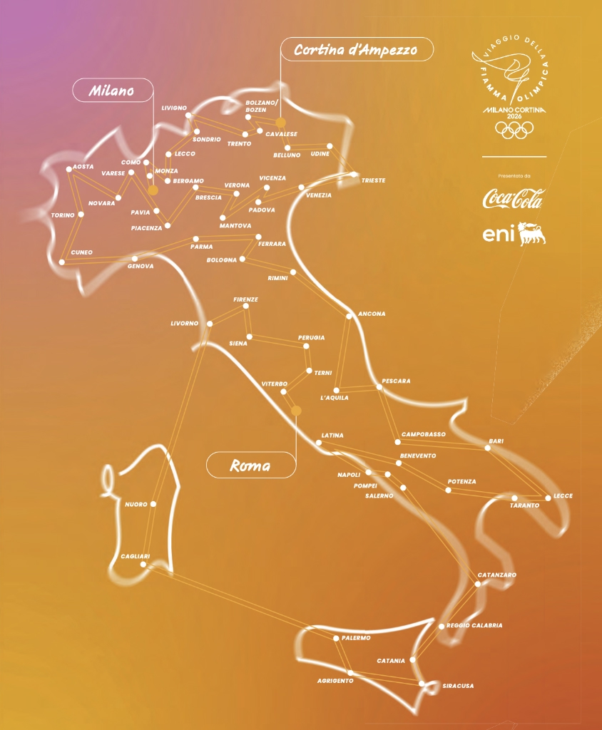 △米兰冬奥会火炬在意大利境内的传递路线图。图源:米兰冬奥组委