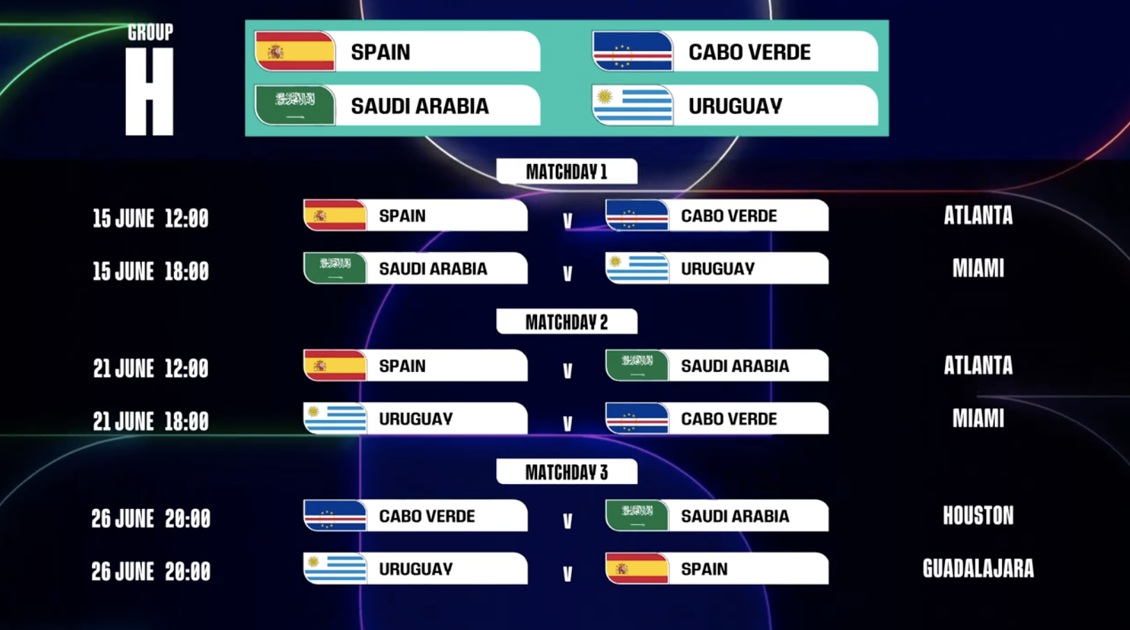 第1轮 沙特阿拉伯vs乌拉圭:6月15日,18:00,迈阿密