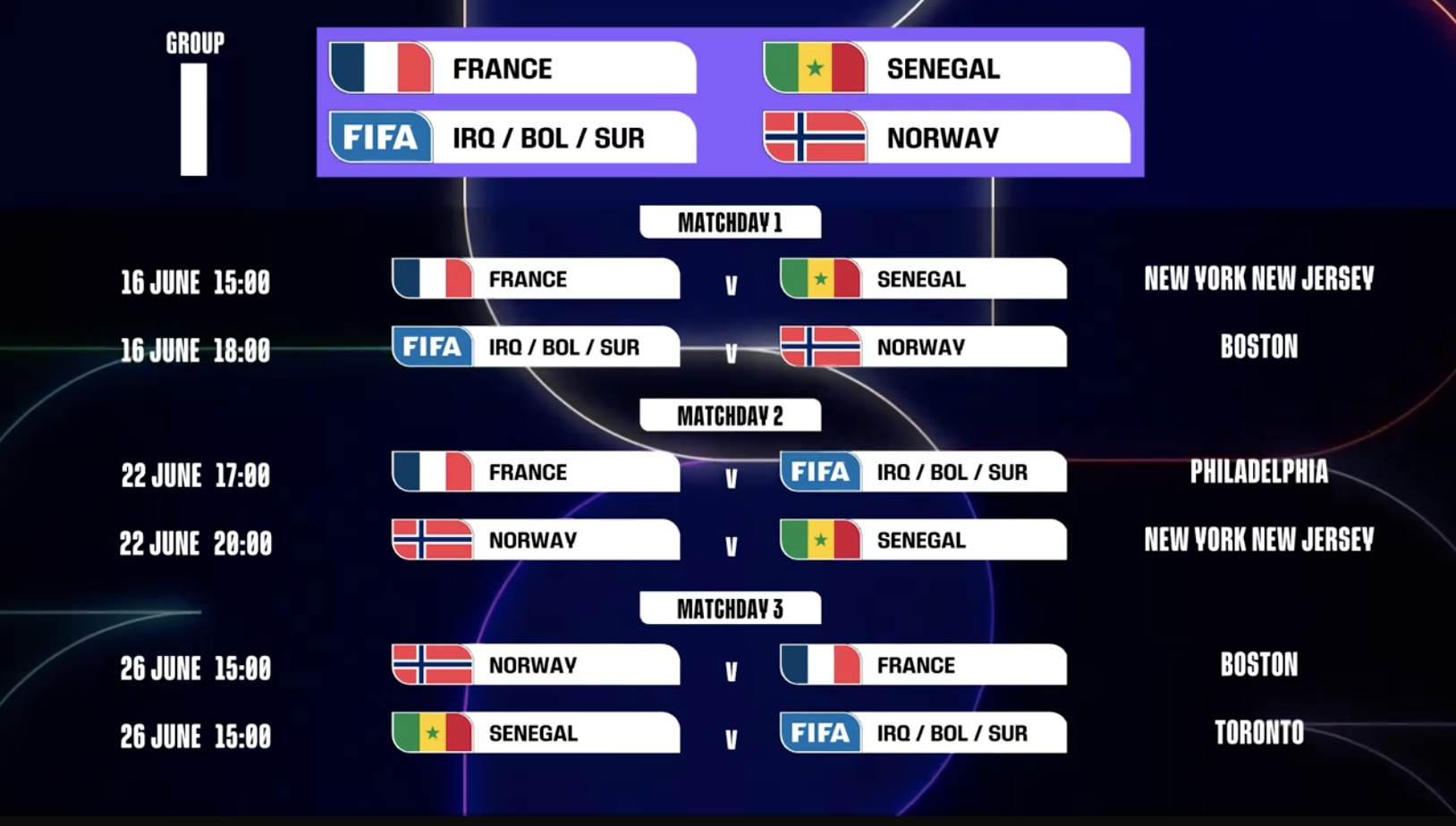 第1轮 洲际附加赛2组胜者vs挪威:6月16日,18:00,波士顿
