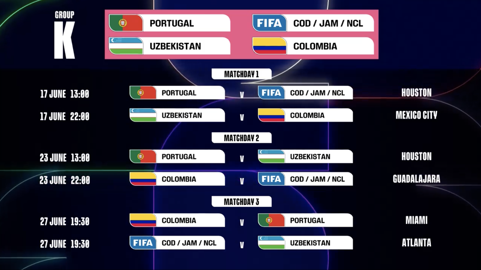 第1轮 乌兹别克斯坦vs哥伦比亚:6月17日,22:00,墨西哥城