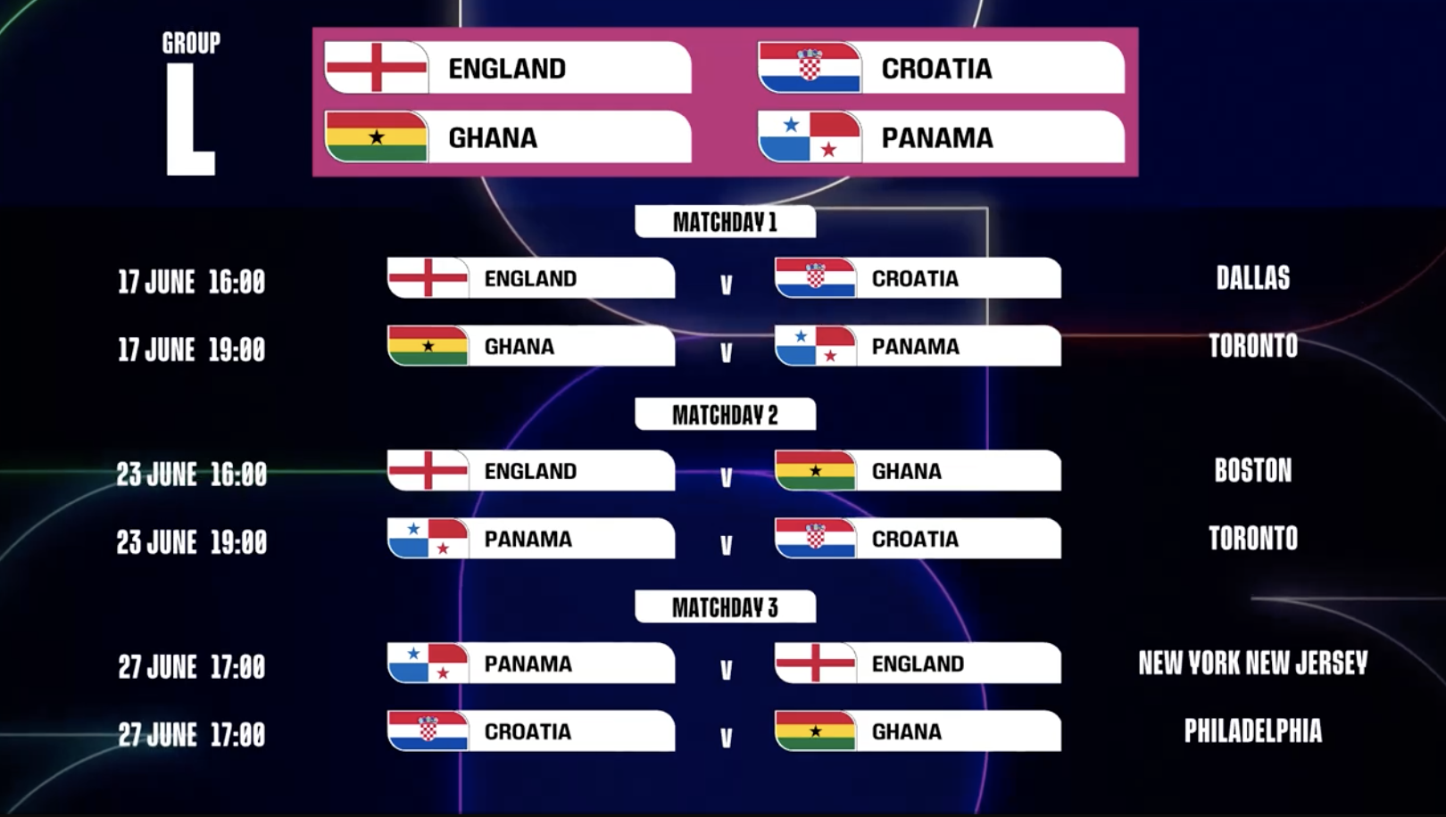 第3轮 巴拿马vs英格兰:6月27日,17:00,纽约/新泽西