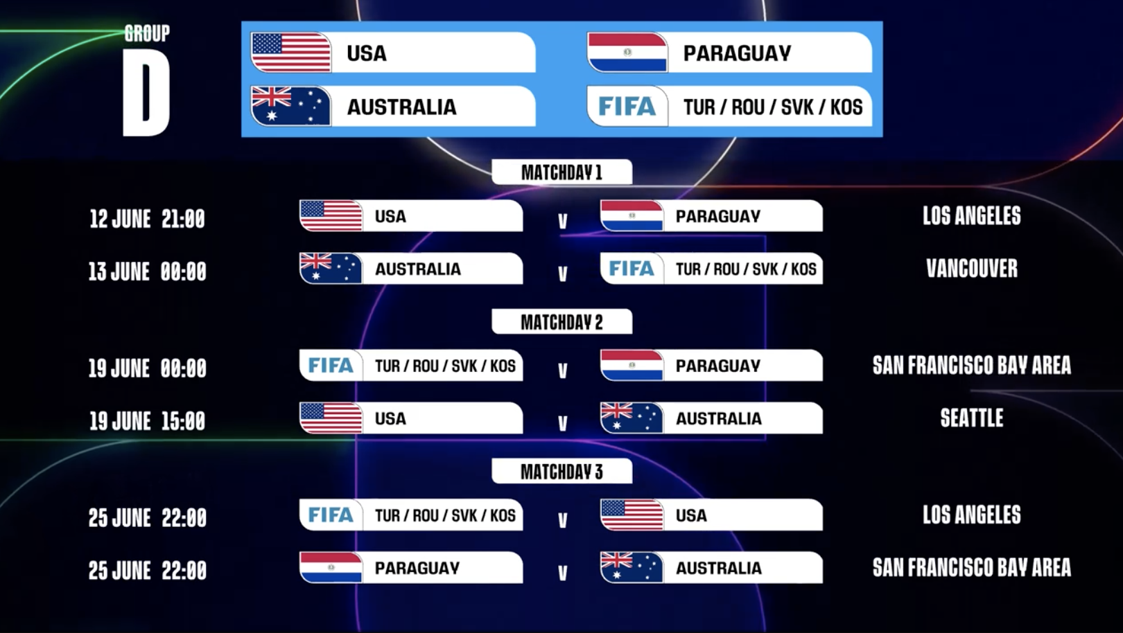 第3轮 巴拉圭vs澳大利亚:6月25日,22:00,旧金山湾区