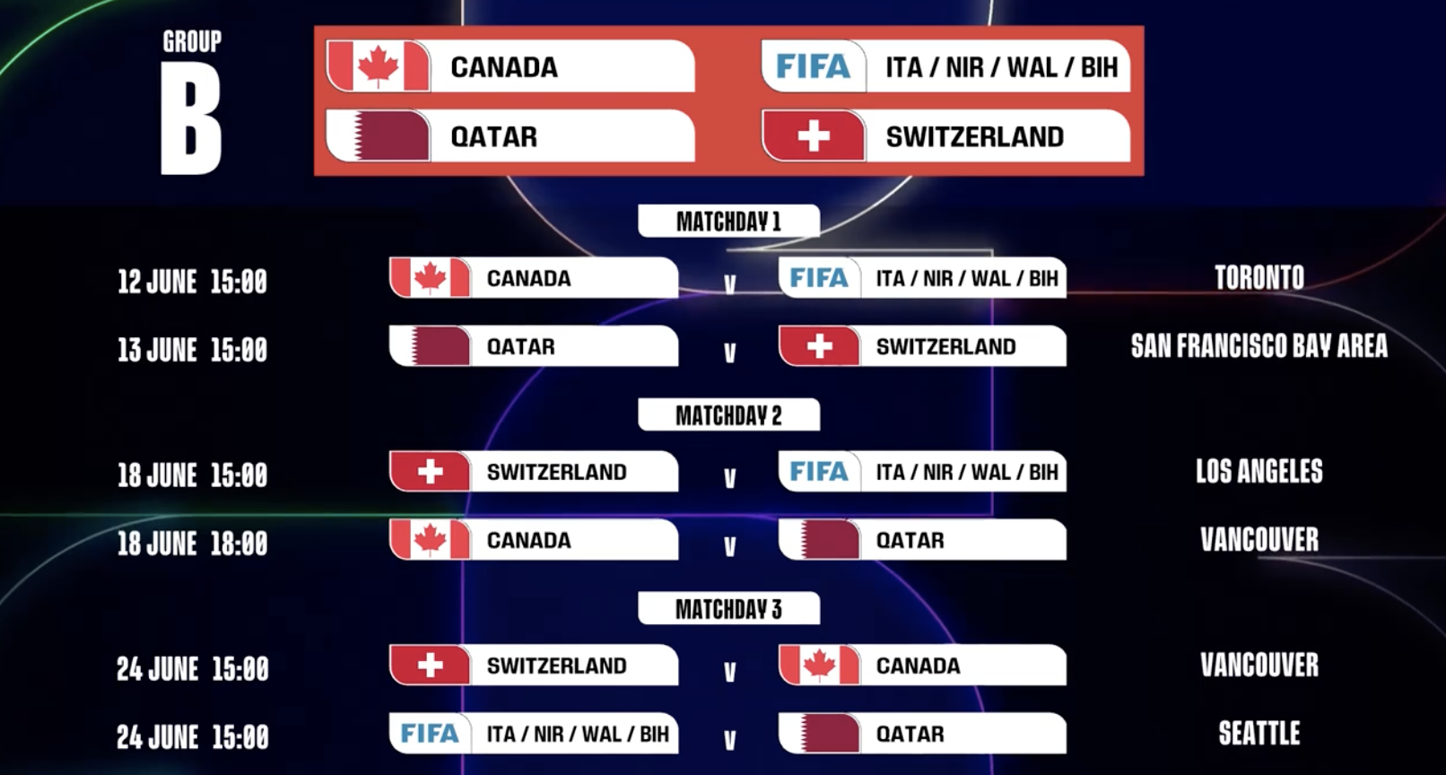 第2轮 加拿大vs卡塔尔:6月18日,18:00,温哥华