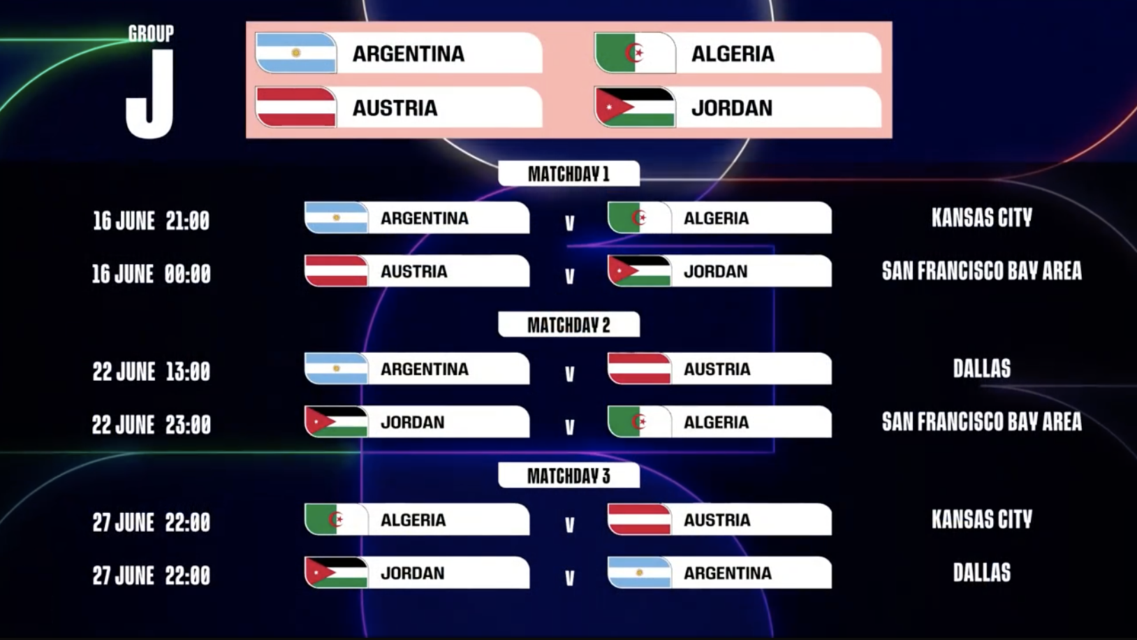 第2轮 阿根廷vs奥地利:6月22日,13:00,达拉斯