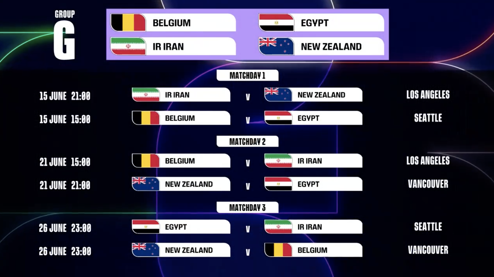 第1轮 伊朗vs新西兰:6月15日,21:00,洛杉矶