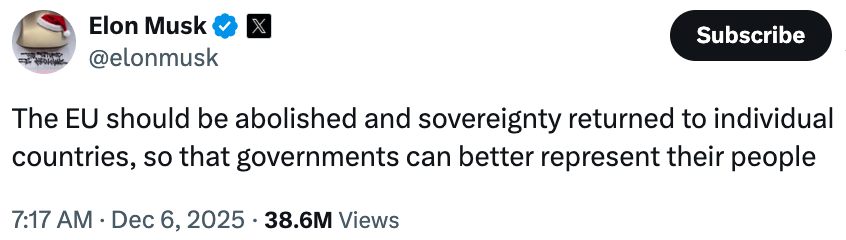 罚单宣布后,马斯克在X上直接回了一句粗口式点评,接着连发多条帖文抨击欧盟委员会。随后,他干脆把矛头指向整个欧盟体制,公开写道:“欧盟应该被废除,主权必须归还各个国家”,把一场合规执法,上升为了对欧盟组织的挑战。