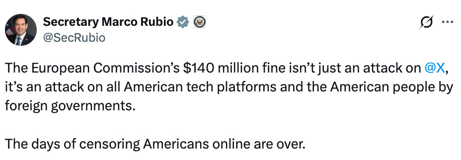 △鲁比奥在X发帖称,欧委会此举是“外国政府对美国科技平台和美国人民的攻击”